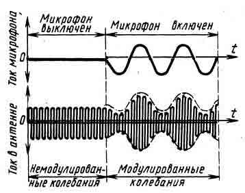 | Рис. 3 При действии звука на микрофон ток высокой частоты в антенне передатчика изменяется по амплитуде. |