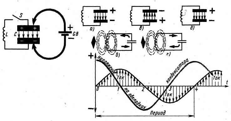 Если источник тока отключить от конденсатора, то конденсатор окажется заряженным (рис. 6, б). Переходу избыточных электронов с одной обкладки на другую препятствует диэлектрик. Между обкладками конденсатора тока не будет, а накопленная им электрическая энергия будет сосредоточена в электрическом поле диэлектрика. Но стоит обкладки заряженного конденсатора соединить каким - либо проводником (рис. 6, в), «лишние» электроны отрицательно заряженной обкладки перейдут по этому проводнику на другую обкладку, где их недостает, и конденсатор разрядится. В этом случае в образовавшейся цепи также возникает кратковременный ток, называемый током разрядки конденсатора. Если емкость конденсатора большая, и он заряжен до значительного напряжения, момент его разрядки сопровождается появлением значительной искры и треска. Свойство конденсатора накапливать электрические заряды и разряжаться через подключенные к нему проводники используется в колебательном контуре радиоприемника. А теперь, вспомните обыкновенные качели. На них можно раскачиваться так, что «дух захватывает». Что для этого надо сделать? Сначала подтолкнуть, чтобы вывести качели из положения покоя, а затем прикладывать некоторую силу, но обязательно только в такт с их колебаниями. Без особого труда можно добиться сильных размахов качелей - получить большие амплитуды колебаний. Даже маленький мальчик может раскачать на качелях взрослого человека, если будет прикладывать свою силу умеючи. Раскачав качели посильнее, чтобы добиться больших амплитуд колебаний, перестанем подталкивать их. Что произойдет дальше? За счет запасенной энергии они некоторое время свободно качаются, амплитуда их колебаний постепенно убывает, как говорят, колебания затухают, и, наконец, качели остановятся. При свободных колебаниях качелей, так же как свободно подвешенного маятника, - запасенная потенциальная энергия переходит в кинетическую энергию движения, которая в крайней верхней точке вновь переходит в потенциальную, а через долю секунды - опять в кинетическую. И так до тех пор, пока не израсходуется весь запас энергии на преодоление трения веревок в местах подвеса качелей и сопротивления воздуха. При сколь угодно большом запасе энергии свободные колебания всегда являются затухающими: с каждым колебанием их амплитуда уменьшается и колебания постепенно совсем затухают - качели останавливаются. Но период, т. е. время, в течение которого происходит одно колебание, а значит, и частота колебаний остаются постоянными. Однако, если качели все время подталкивать в такт с их колебаниями и тем самым пополнять потери энергии, расходуемой на преодоление различных тормозящих сил, колебания станут незатухающими. Это уже не свободные, а вынужденные колебания. Они будут длиться до тех пор, пока не перестанет действовать внешняя подталкивающая сила. Я вспомнил здесь о качелях потому, что физические явления, происходящие в такой механической колебательной системе, очень схожи с явлениями в электрическом колебательном контуре. Чтобы в контуре возникли электрические колебания, ему надо сообщить энергию, которая «подтолкнула» бы в нем электроны. Это можно сделать, зарядив, например, его конденсатор. Разорвем выключателем S колебательный контур и подключим к обкладкам его конденсатора источник постоянно