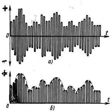 Посмотрите на графики, показанные на (рис. 12). Они иллюстрируют процессы, происходящие в детекторной цепи простейшего приемника. Под действием радиоволн в контуре приемника возбуждаются модулированные колебания радиочастоты (рис. 12, а). К контуру подключена цепь, состоящая из диода и телефонов.