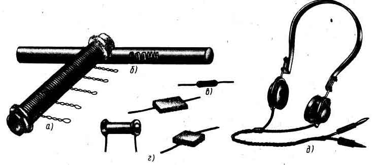 | Рис. 1 Самодельная катушка индуктивности (а), феритовый стержень (б), точечный диод (в), конденсаторы (г) и головные телефоны (д), необходимые для опытного приемника. |
