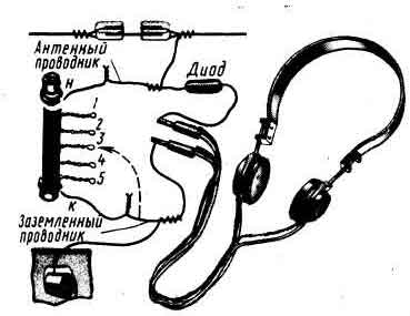 Концы выводов и отводов, катушки зачистить от изоляции, только осторожно, чтобы не порвать провод. Один из крайних выводов назовем началом катушки и обозначим буквой (н). Соедините его с диодом. Второй крайний вывод катушки, ее конец (к), соедини с одним из контактных штырьков шнура головных телефонов. Оставшиеся свободными вывод диода и штырек телефонов тоже соедините между собой. К проводнику, идущему от начала катушки к диоду, прочно прикрутите провод антенны, предварительно зачистив его от изоляции. Этот проводник приемника будем называть антенным. К проводнику, соединяющему конец катушки с телефонами, прикрутите провод заземления. Это будет заземленный проводник. Во время опытов его придется переключать с одного вывода катушки на другой (на рис. 2 показано штриховой линией со стрелкой), не изменяя при этом соединения заземления с телефонами. Совершим «прогулку» по цепям получившегося приемника. От начала катушки (н) по антенному проводнику мы попадаем к диоду, а от него - к головным телефонам. Через телефоны, далее по заземленному проводнику и через все витки катушки приходим к отправной точке (н). Получилась замкнутая электрическая цепь, состоящая из катушки, диода и телефонов. Ее называют детекторной. Если в этой цепи где - либо окажется обрыв, плохой контакт между деталями или соединительными проводниками, например непрочная скрутка, приемник, естественно, работать не будет. Кратчайший путь из антенны в землю - через катушку. По этому пути пойдет ток высокой частоты, возбуждаемый в антенне радиоволнами. Этот ток создаст на концах катушки высокочастотное напряжение, которое вызовет ток такой же частоты во всей детекторной цепи. Цепь, состоящую из антенны, катушки и заземления называют антенной или антенным контуром. Обратите внимание: контурная катушка приемника входит как в антенную, так и в детекторную цепи. После такой прогулки по цепям приемника можно перейти к его испытанию. Наденьте на голову телефоны, прижмите их плотнее к ушам, прислушайтесь. Возможно, что сразу вы ничего не услышите даже при заведомо хороших антенне и заземлении, предварительно проверенных диоде и телефонах. Это потому, что приемник, видимо, не настроен на несущую частоту радиовещательной станции, сигналы которой хорошо слышны в вашем районе, или вы попали в перерыв передачи. Настраивать такой приемник можно изменением числа витков катушки, включаемых в антенный контур. На (рис. 2) в антенный контур включены все 300 витков катушки. Если заземленный проводник отсоединить от конца катушки и присоединить, например, к отводу 5, то в контур будет включено уже не 300, а 250витков. Если же этот проводник переключить на отвод 4, в контур будет включено 200 витков. При переключении его на отвод 3 в антенный контур будет включено 150 витков и т.д. При этом нижние секции окажутся не включенными в контур и в работе приемника участвовать не будут. Таким образом, переключением заземленного проводника вы можете включать в контур разное число витков через 50 витков. Запомните: чем больше длина волны радиовещательной станции, на которую можно настроить приемник, тем большее число витков катушки должно быть включено в антенный контур. Ваш опытный приемник можно настраивать на радиовещательные станции как средневолнового, так и длинноволнового диапазонов. Но, разумеется, пе