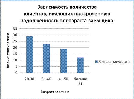 Таким образом, можно сделать вывод, наибольшее количество людей имеет просрочку от 31 до 90 дней, сумму кредита 101-200 тыс.руб. при просроченной задолженности на сумму 21-50 тыс.руб. При этом на просрочку выходят заемщики в возрасте 20-30 лет. Кредиты со сроком просрочки входят в портфель №3 (сомнительные ссуды) со ставкой резервирования 20%.