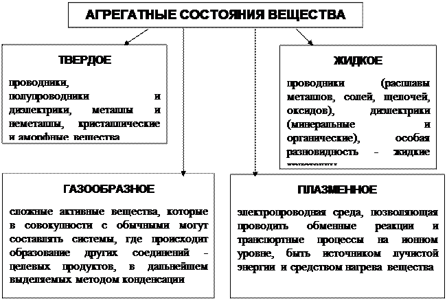 Применение электротехнологий позволяет с веществом, находящимся в каждом из агрегатных состояний (показано на нижеприведенной блок-схеме, рис. 1.1), посредством постоянных и переменных (различной частоты) токов, постоянных и переменных электрических и магнитных полей (с широким диапазоном напряженностей) совершать бесчисленное множество операций, а именно: изменение температуры, формы, структуры, состава, изменение свойств в разных направлениях и т.д.