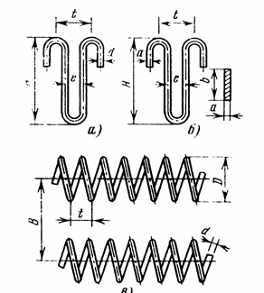| Рис. 3.4. Эскизы проволочных и ленточных нагревателей с обозначением основных геометрических размеров: а – проволочный зигзагообразный; б – то же ленточный; в – спиральный |