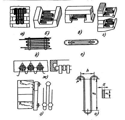 | Рис. 3.5. Конструкции ленточных нагревателей: а – ленточные зигзагообразные нагреватели на боковой стенке на металлических крючках; б – ленточный зигзагообразный нагреватель в поду; в – то же в своде; г – то же на керамических полочках; д – выемной высокотемпературный рамочный элемент; е – низкотемпературный рамочный элемент; ж – нагреватель «плоская волна» на керамических трубках; з – ленточный зигзагообразный нагреватель на выемных крючках; и – условное обозначение размеров ленточного зигзагообразного нагревателя |