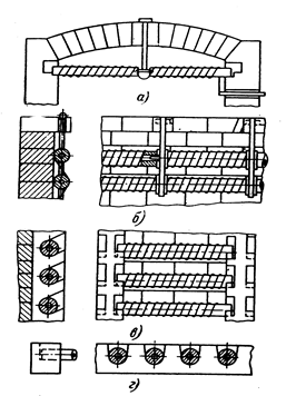 | Рис. 3.6. Конструкции проволочных спиральных нагревателей на керамических трубках: а – сводовые нагреватели; б – трубки на боковых стенках, крепление на жароупорных подвесках; в – то же в пазах керамических столбиков; г – трубки в поду |