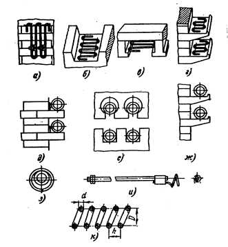 | Рис. 3.7. Проволочные нагреватели: а – проволочный зигзагообразный нагреватель на боковой стенке на металлических крючках; б – проволочный зигзагообразный нагреватель в поду; в – то же в своде; г – то же на керамических полочках; д – проволочная спираль на выступающих кирпичах боковой стены с привязкой к крючкам; е – проволочная спираль в сводовых камнях и в пазах пода; ж – проволочная спираль на керамических полочках; з – проволочная спираль на керамической трубке; и – вывод проволочного нагревателя; к – условное обозначение размеров проволочного нагревателя |