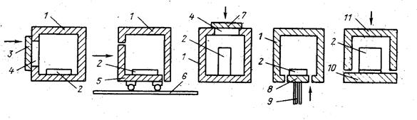 | Рис. 4.5. Схема печей периодического действия: а – камерная с загрузкой через окно; б – камерная с выдвижным подом; в – шахтная; г – элеваторная; д – колпаковая; 1 – каркас печи с футеровкой; 2 – нагреваемые тела (загрузка); 3 – дверца; 4 – загрузочный проем (окно); 5 – выдвижной под; 6 – рельс; 7 – крышка; 8 – опускающийся под; 9 – механизм опускания; 10 – стенд; 11 – съемный колпак Стрелкой показано направление движения загрузки при подаче ее в рабочее пространство печи |