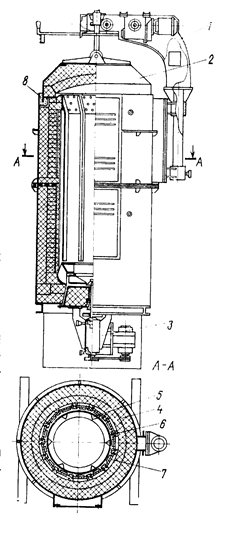 | Рис. 4.12. Шахтная электропечь: 1 – нагреватели; 2 – огнеупорная кладка; 3 – теплоизоляция; 4 – крышка печи; 5 – вывод нагревателя; 6 - термопара | Рис. 4.13. Шахтная электропечь: 1 — механизм подъема и поворота крышки; 2 — крышка; 3 — вентилятор; 4 — футеровка; 5 — направляющие; 6 — экран; 7 — нагреватели; 8 — песочный затвор |