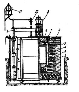 Детали нагреваются горячим воздухом, который подается вентилятором 3, установленным на крышке 2, входящей в песочный затвор 5. Вокруг корзины 4 с деталями размещены проволочные нагреватели 6 . Кожух 1 печи сделан из листовой стали. Обычно шахтные печи углубляют в приямок.