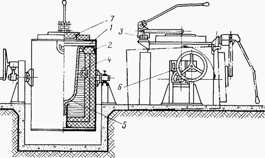 | Рис. 4.42. Тигельная плавильная электропечь: 1 - кожух; 2 - футеровка; 3 - механизм подъема; 4 – нагреватель; 5 - тигель; 6 - механизм наклона; 7- крышка |
