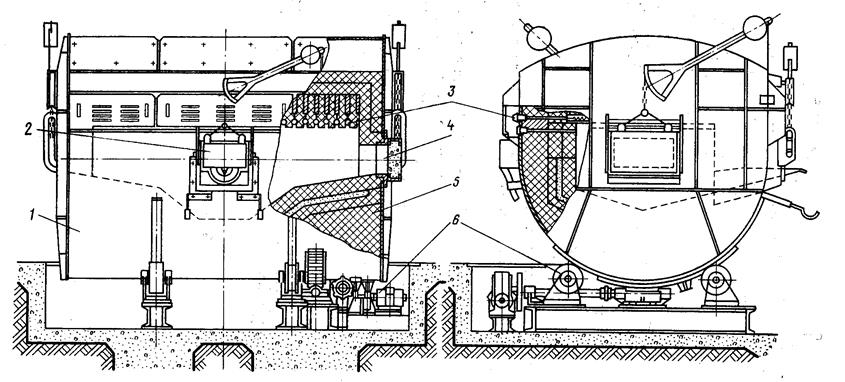 | Рис. 4.43. Камерная плавильная электропечь с механизмом наклона: 1 – кожух; 2 – сливное окно; 3 – нагреватель; 4 – загрузочное окно; 5 – футеровка; 6 – механизм наклона |