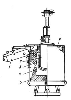 | Рис. 4.44. Тигельная плавильная электропечь с механическим дозатором вытеснения металла: 1 – желоб; 2 - механический вытеснитель; 3 – тигель; 4 – нагреватель; 5 – футеровка; 6 – кожух |