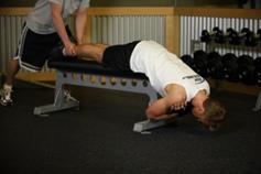 - Лягте на горизонтальную скамью лицом вниз, таким образом, чтобы ваши бедра находились на краю скамьи, а вы могли выполнить наклон вниз, сгибаясь в талии, без ощущения дискомфорта. Подсказка: ваше положение должно быть идентично положению на скамье для гиперэкстензии, но амплитуда движений будет меньшей, ограничиваясь высотой скамьи. Напарник должен надежно зафиксировать ваши ноги.