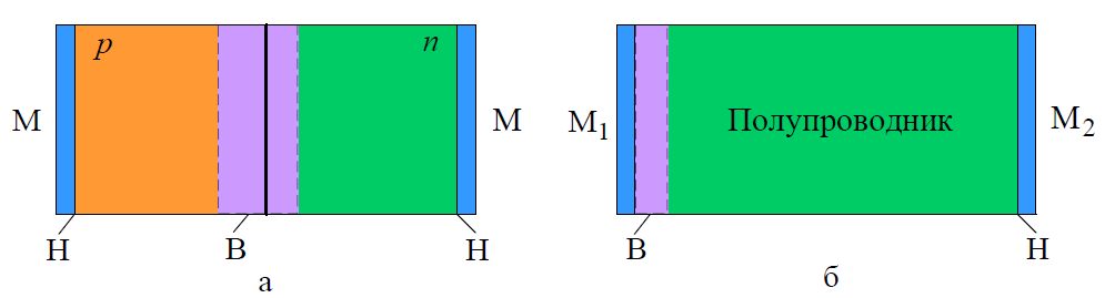 Рис 1. Структуры полупроводниковых диодов: с выпрямляющим p–n-переходом (а); с выпрямляющим переходом на контакте «металл – полупроводник» (б). Н – невыпрямляющий электрический (омический) переход. В – выпрямляющий электрический переход. М – металл.