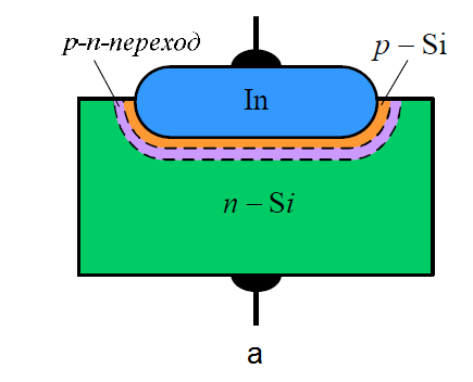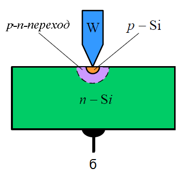 Рис. 2. Структура плоскостного диода, изготовленного методом сплавления (а); структура точечного диода (б)