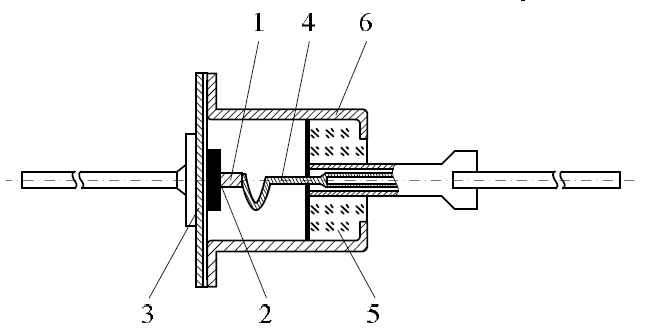 1 – кристалл индия; 2 - германий n-типа; 3 - стальной кристаллодержатель; 6 – корпус; 5 - стеклянный проходной изолятор; 4 - внутренний вывод (имеет специальный изгиб для уменьшения механических напряжений при изменении температуры). Условное графическое обозначение выпрямительного диода приведено на рис. 4.