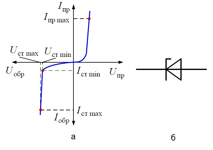 Рисунок 6. Вольт-амперная характеристика стабилитрона (а), УГО (б)