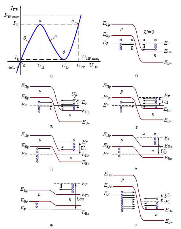 В равновесном состоянии системы уровень Ферми постоянен для обеих областей полупроводникового диода, поэтому другие энергетические уровни искривляются настолько сильно, что нижняя граница дна зоны проводимости области n-типа оказывается ниже верхней границы потолка валентной зоны области p-типа, и так как переход очень узкий, то носители заряда могут переходить из одной области в другую без изменения своей энергии, просачиваться сквозь потенциальный барьер, т.е. туннелировать (рисунок 7 (б)). В состоянии равновесия потоки носителей из одной области в другую одинаковы, поэтому результирующий ток равен нулю. Под воздействием внешнего поля энергетическая диаграмма изменится. При подключении прямого напряжения уровень Ферми и положение энергетических зон сместится относительно равновесного состояния в сторону уменьшения потенциального барьера и при этом степень перекрытия между потолком валентной зоны материала p-типа и дном зоны проводимости материала n-типа уменьшится (рисунок 7 (в)). При этом в зоне проводимости материала n-типа уровни, заполненные электронами (ниже уровня Ферми) окажутся против незаполненных уровней в валентной зоне материала p-типа, что приведет к появлению тока, обусловленного большим количеством электронов, переходящих из п-области в р-область. Максимальное значение этого тока будет тогда, когда уровень Ферми материала п-типа и потолок валентной зоны материала р-типа будут совпадать (рисунок 7 (г)). При дальнейшем увеличении прямого напряжения туннельное перемещение электронов из п-области в р-область начнет убывать (рисунок 7 (д)), так как количество их уменьшается по мере уменьшения степени перекрытия между дном зоны проводимости материала п-типа и потолком валентной зоны материала р-типа. В точке, где эти уровни совпадают, прямой ток р–п-перехода достигнет минимального значения (рисунок 7 (е)), а затем, когда туннельные переходы электронов станут невозможны (рисунок 7 (ж)), носители заряда будут преодолевать потенциальный барьер за счет диффузии и прямой ток начнет возрастать, как у обычных диодов.