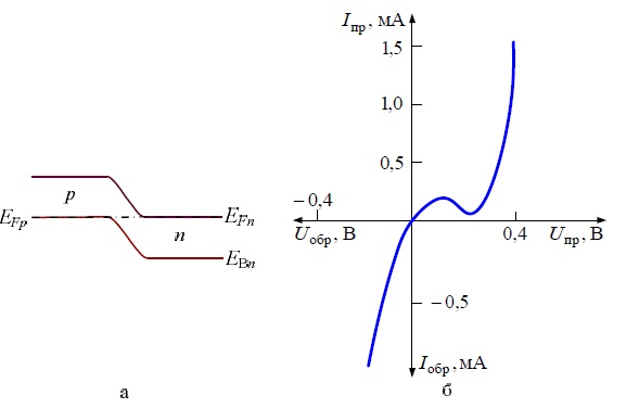 Рисунок 8. Зонная энергетическая диаграмма (а) и вольт-амперная характеристика (б) типичного обращенного диода