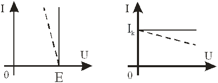 Для того, чтобы источник тока мог давать ток Ik, не зависящий от величины сопротивления нагрузки, внутреннее сопротивление его должно стремиться к бесконечности. Но и ЭДС Е также должна стремиться к бесконечности, так как отношение двух бесконечных величин Е и Rв равно конечной величине − току Ik. ВАХ такого источника показана на рис. 4, б (сплошная линия).