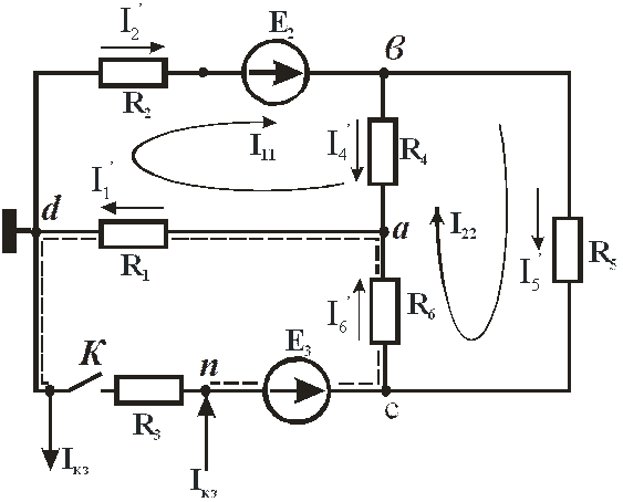 В схеме на рис. 14 выберем произвольно направления токов в ветвях и выберем два независимых контурах авdа и авса.