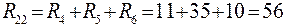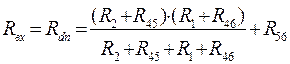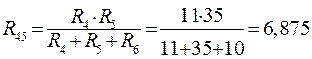 В схеме рис. 15 можно преобразовать звезду резисторов R2, R4, R5 в эквивалентный треугольник или же любой из треугольников резисторов R1, R4, R2 и R4, R5, R6 в эквивалентную звезду. Указанные преобразования равноправны. Преобразуем треугольник резисторов R4, R5, R6 в эквивалентную звезду R45, R46, R56 (рис. 16).