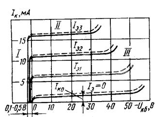 Нулевая характеристика (Uкэ = 0, Uб < 0)- это суммарная характеристика эмиттерного и коллекторного переходов, соединенных параллельно и подключенных к источнику питания в прямом направлении. В коллекторной цепи протекает ток, противоположный обычному току коллектора. Iк отрицателен, а ток базы равен