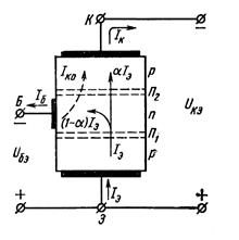 где b = Iк/ Iб = a/ (1 - a ) - коэффициент передачи тока базы в схеме ОЭ. При a = (0,9 - 0,99), b = (9 – 99) - получаем усиление по току