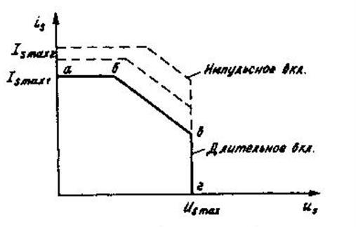 На рис. 39 представлена область безопасной работы (ОБР) транзистора при постоянном и импульсном токах различной длительности. Участок аб соответствкет предельному значению постоянного токк. Участок бв - ограничивает ОБР в соответствии с максимально допустимой мощностью потерь в приборе. Участок вг соответствует максимально допустимому значению напряжения коллектор-эмиттер. В импульсном режиме работы границы ОБР расширяются, чем короче импульс тем больше могут быть допустимый ток и мощность.