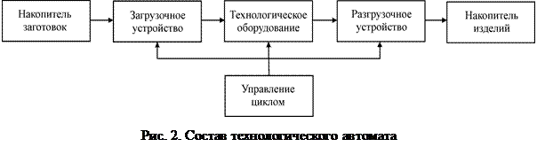 В составе технологического автомата можно выделить: технологическую машину, предназначенную для выполнения требуемой технологической операции (или их набора); загрузочно-разгрузочное устройство, предназначенное для автоматической подачи заготовок на рабочую позицию технологической машины и удаления обработанных изделий; устройство управления, обеспечивающее требуемый рабочий цикл автомата.