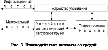 С внешней технологической средой автомат связан через материальный и информационный потоки. Материальный поток включает движение поступающих в автомат заготовок и материалов, удаляемых обработанных изделий и технологических отходов. Информационный поток автомата определяется поступающими извне командами и управляющими сигналами, а также информационными сигналами, генерируемыми устройствами автомата и несущими информацию о его состоянии. Для "жесткого" автомата информационный поток минимален. Этот поток определяется ограниченным набором команд, поступающих извне, и осведомительных сигналов, выдаваемых системой управления автомата (например, команды: "пуск", "стоп", "режим" и др.; сигналы: "автоматическая работа", "наладка" и др.).