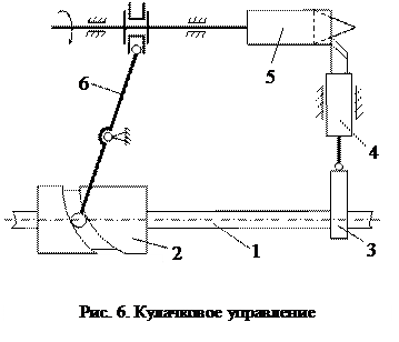 При управлении от кулачкового вала траектория взаимного перемещения объекта обработки 5 и обрабатывающего инструмента 4 определяется торцевым 2 и радиальным 3 кулачками, закрепленными на вращающемся валу 1. Рычаг 6 передает движение торцевого кулачка 2 объекту обработки 5. Профили обеих кулачков должны быть согласованы. Величина и скорость перемещений определяется профилем кулачков. При изменении траектории взаимного движения кулачки приходится заменять.