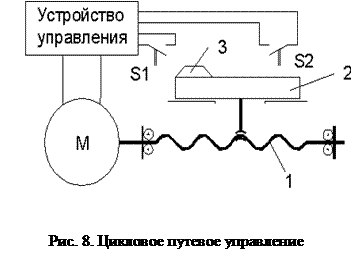 В случае циклового управления (рис. 8) устройство управления получает информацию о положении объекта управления 2 от конечных или путевых выключателей S1 и S2. Включая или реверсируя электродвигатель М привода, устройство управления обеспечивает требуемое позиционирование объекта 2 с помощью ходового винта 1. Упор 3 взаимодействует с конечными выключателями. Величина перемещений определяется установкой конечных выключателей или упоров. При перестройке подобной системы приходится изменять положение конечных выключателей и перестраивать цикл устройства управления.