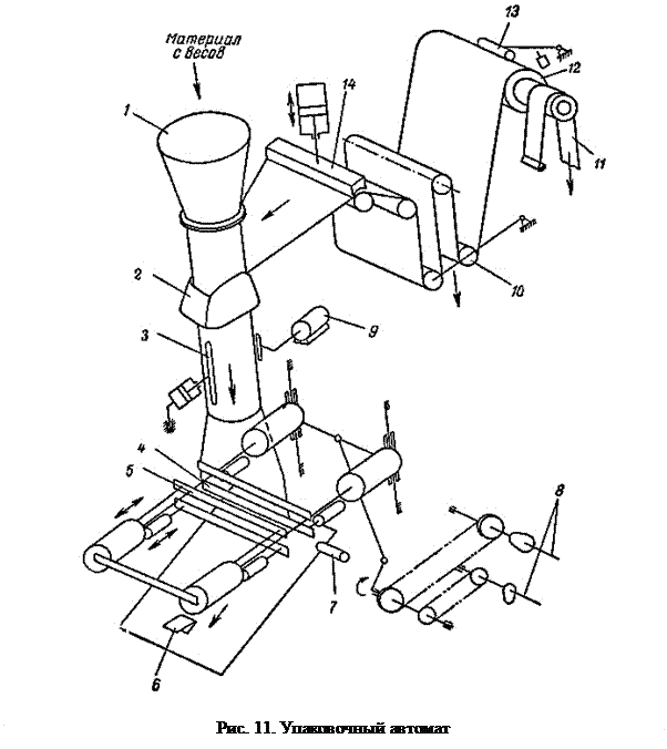 Принципиальная схема упаковочного автомата, используемого в шинной и резинотехнической промышленности, показана на рис.11.
