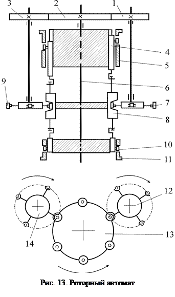 Схема роторного автомата приведена на рис. 13. В составе автомата можно выделить следующие элементы: 1, 2, 3 – зубчатые колеса привода; 4, 10 – ползуны перемещения инстру-ментальных блоков; 5, 11 – неподвижные копиры, 6 – центральный вал; 7, 9 – несущий орган транспортного ротора; 8 – инструментальный блок; 12, 14 – транспортные роторы, 13 – рабочий ротор.