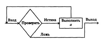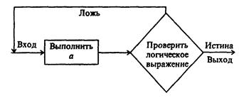 Цикл начинается с проверки логического выражения. Если оно истинно, то выполняется «a», затем все повторяется снова, пока логическое выражение сохраняет значение «истина». Как только оно становится ложным, выполнение операций «а» прекращается и управление передается по программе дальше.