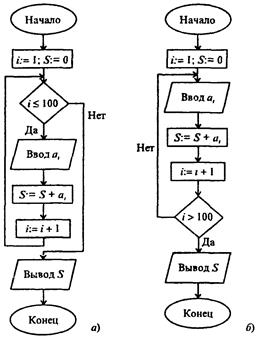 Существует и иная конструкция цикла, которая предусматривает проверку условия, по которому, наоборот, выполнение команд циклической части прекращается, после команд циклической части (см. рис. 1.23).