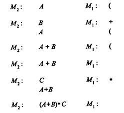 Теперь дадим правило работы со скобками. Левая скобка заносится в M1 сразу после прочтения. Прочтение правой скобки влечет выполнение всех операций, знаки которых находятся в Mi выше левой скобки; после выполнения этих операций обе скобки уничтожаются. Вот что будет происходить при выполнении (а + b) * с: