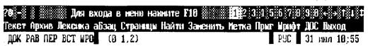 Здесь верхняя строка одновременно является строкой комментариев к пунктам меню, и пользователю легко понять их назначение. Функциональные клавиши имеют достаточно стандартные назначения. Например, F1 - помощь, F9 - переключение с русского на латинский режимы, F10 - выход в меню.