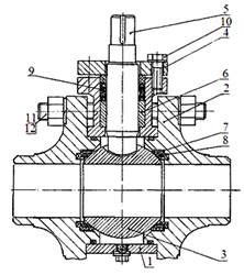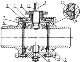 1 - корпус; 2 - фланець; 3 - куля; 4 - кришка; 5 - шпиндель; 6 - направляюча вісь; 7 - контрсідло; 8 - сідло; 9 – полімерне ущільнення; 10 - тарілчаста пружина; 11 - шпонка; 12 - гвинт.