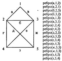 Введем обозначения, как показано на рис. 3.17. Ребра графа обозначены буквами а, б, в ... (литерные константы), вершины - цифрами 1, 2, 3 ... Опишем структуру графа предикатом вида «ребро (S, А, В)», что означает, что от вершины А к вершине В идет ребро S. Так как граф неориентированный, помимо предикатов вида «ребро (S, А, В)» нужны и предикаты «ребро (S, В, А)». Знания о структуре графа можно представить так, как это записано рядом с рис. 3.17.