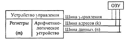 Схема обмена информацией между микропроцессором и ОЗУ представлена на рис. 4.12. Данные поступают из ОЗУ в регистры процессора и наоборот по шине данных; по шине адреса передается информация о месте хранения данных в ОЗУ. Разрядности этих шин могут не совпадать: например, упомянутый выше МП «Intel 8088» характеризовался значениями m/n/k = 16/8/20. Когда говорят, не вникая в детали, «16-разрядная ЭВМ», то имеют в виду значение т. Поскольку объем адресного пространства ОЗУ, контролируемого МП, равен 2k, то понятно стремление увеличить разрядность шины адреса.