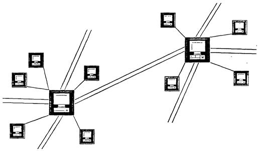 Конечный пользователь включается в обмен по своему усмотрению в желаемое для него время. Он соединяется с ближайшей к нему хост-машиной, которая, в свою очередь, соединяется с другими хост-машинами в соответствии с адресом, указываемым пользователем сети, затем происходит обмен информацией. Если пользователь работает в режиме on-line, то он сразу получает поступающую информацию и подает новые команды в сеть для получения новых порций информации. В режиме off-line пользователь сети при соединении с хост-машиной лишь передает свои сообщения и получает поступившую для него к этому времени информацию. Хост-машина хранит поступившие на нее сообщения до тех пор, пока пользователь их не заберет (или ограничивается разумным сроком хранения). Хост-машины постоянно связаны между собой по выделенным каналам связи и обмениваются информацией в автоматическом режиме под управлением специальных программ. Структура такой сети схематически изображена на рис. 5.3.