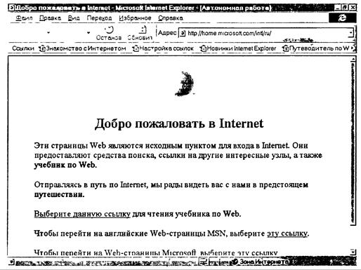 В окне Internet Explorer отображается HTML-документ, полученный изInternet или загруженный из файла. Навигация (перемещение) по такому документу осуществляется с помощью ссылок - выделенных в документе фраз или областей. Курсор превращается на ссылках в пиктограмму кисти руки с вытянутым пальцем, которым можно выбрать или нажать выделенную фразу или область. Полезные для навигации кнопки-команды содержатся в меню командInternet Explorer- третьей строке окна. Кнопка «Назад» позволяет возвратиться на предыдущую просмотренную HTML-страницу, кнопка «Вперед» - двигаться вперед по цепочке просмотренных страниц. Кнопка «Останов» служит для остановки передачи данных (если, например, не нужно ждать окончательной досылки картинок и т.п.), кнопка «Обновить», напротив, позволяет возобновить передачу данных текущей страницы в случае, например, сбоя передачи или остановки.
