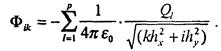 Выберем по осям х и у некоторые шаги hx и hy и покроем плоскость сеткой, образованной прямыми, параллельными осям х и у и отстоящими друг от друга на расстояниях hx и hy соответственно. Точки пересечения этих прямых — узлы сетки. Пронумеруем их так: начало координат (0, 0), следующий по оси x вправо - (0, 1), влево - (0, -1); по оси у вверх - (1, 0), вниз (-1, 0) и т.д. Значения потенциала, создаваемого системой зарядов Q1 … Qp в узле (i ,k), согласно принципу суперпозиции, таково (обратим внимание, что здесь и ниже i - номер строки, k - столбца сетки):