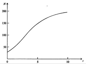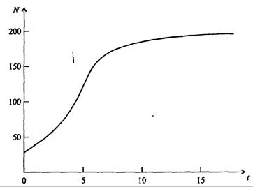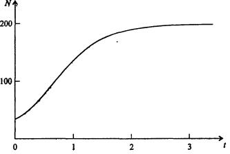 Рис. 7.38. Изменение численности популяции согласно уравнению (7.62) при R = 2, К = 200, N0 = 20