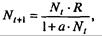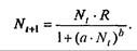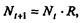 Рассмотрим простейшую из указанных моделей для вида с дискретными периодами размножения, в которой численность популяции в момент времени t равна N, и изменяется во времени пропорционально величине основной чистой скорости воспроизводства R. Такими видами являются, например, большая часть растений, некоторые виды насекомых, у которых разные поколения четко разнесены во времени. Коэффициент R характеризует количество особей, которое воспроизводится в расчете на одну существующую, а также выживание уже существующих. Данная модель может быть выражена уравнением