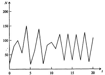 Рис. 7.39, б. Колебательное установление стационарной численности популяции при b =3,9, R =2