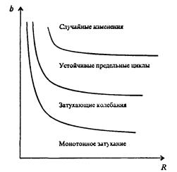 Важной частью исследования, связанного с моделью (7.63), является построение на фазовой плоскости (b, R) границ, которые разделяют монотонное затухание, затухающие колебания, устойчивые предельные циклы и случайные (хаотические) изменения, рис. 7.40 Для этого надо задаться значениями а и N0 и производить расчеты, изменяя параметры b, R. Различить каждый из возможных режимов можно попытаться визуально, выполняя построение на экране компьютера графиков изменения численности популяции и запоминая соответствующие значения параметров b, R при переходе от одного режима к другому. Следует, однако, понимать,